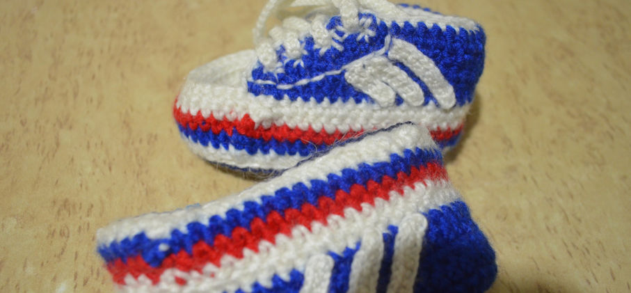 7. Нитью белого цвета вяжем полоски для украшения кед (я вязала полустолбиками полоски длиной 10, 8 и 6 петель), пришиваем их с помощью иголки